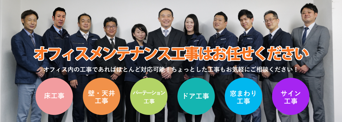 に対応します - オフィス内装工事の内容によっては長時間の工事が必要になるケースがあります。また、オフィス内装工事の内容によっては、お客様の業務を一時中断していただく場合があります。どうしても業務を止めることができないお客様は大阪オフィス内装工事.comにお任せください。私達は休日や夜間のオフィス内装工事にも対応しています。