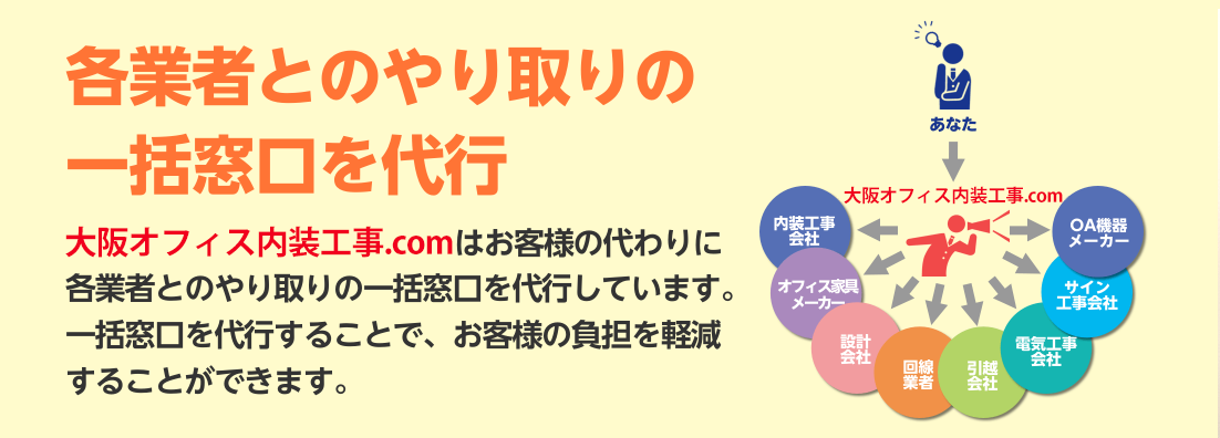 オフィス内装工事を提供します - 大阪オフィス内装工事.comは、大阪府大阪市のお客様を中心にオフィス内装工事のご相談から施工管理まで一貫してサポートをしています。私達はオフィス内装工事を工事業者に丸投げするのではなく、施工管理技士の資格を持ったプロのスタッフが責任を持って施工管理を実施します。大阪府大阪市周辺でオフィス内装工事をお考えのお客様は、ぜひ大阪オフィス内装工事.comにご連絡ください。