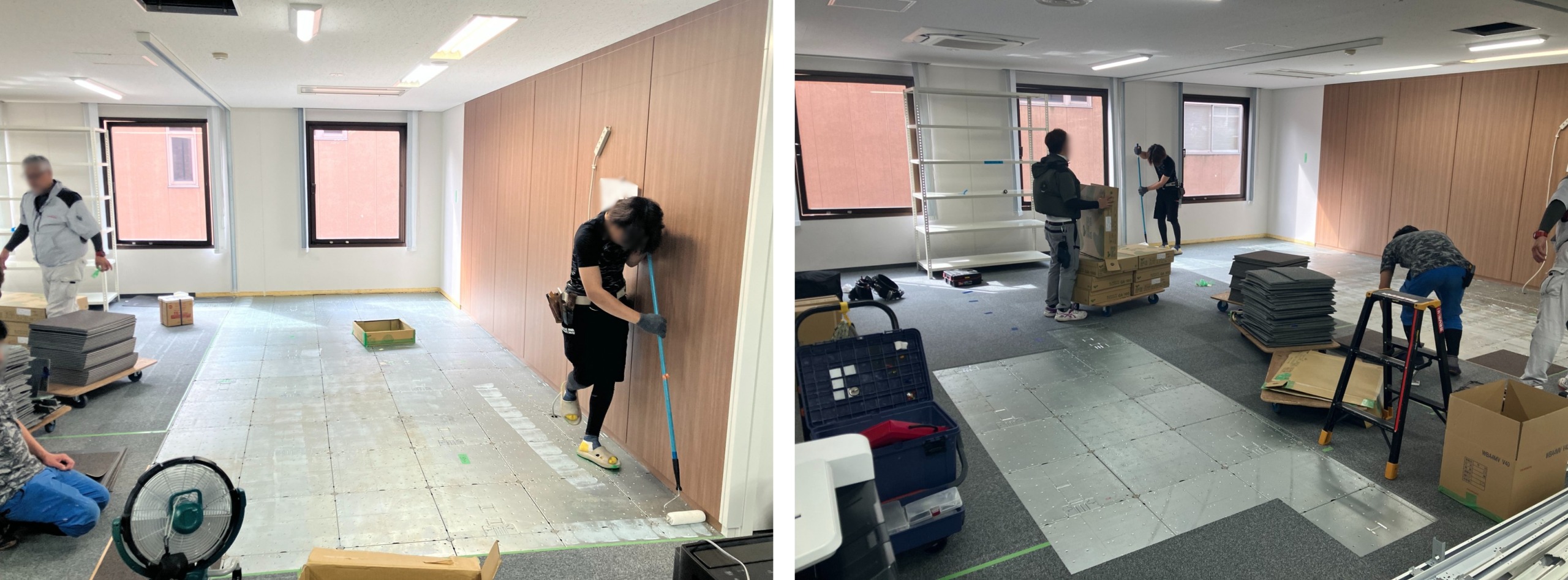 あわせてタイルカーペットの捲り・貼り替え工事を行い、午後にはセキュリティ設備の再設置まで完了しました。