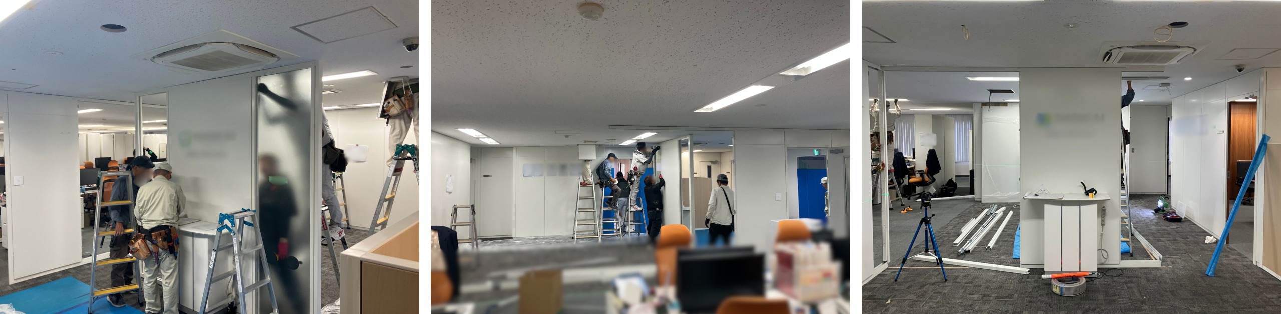 大阪のオフィス内装工事として、既存什器の解体・搬出、間仕切りの解体・組み立て、床工事、新規什器の設置までを、複数日に分けて対応しました。