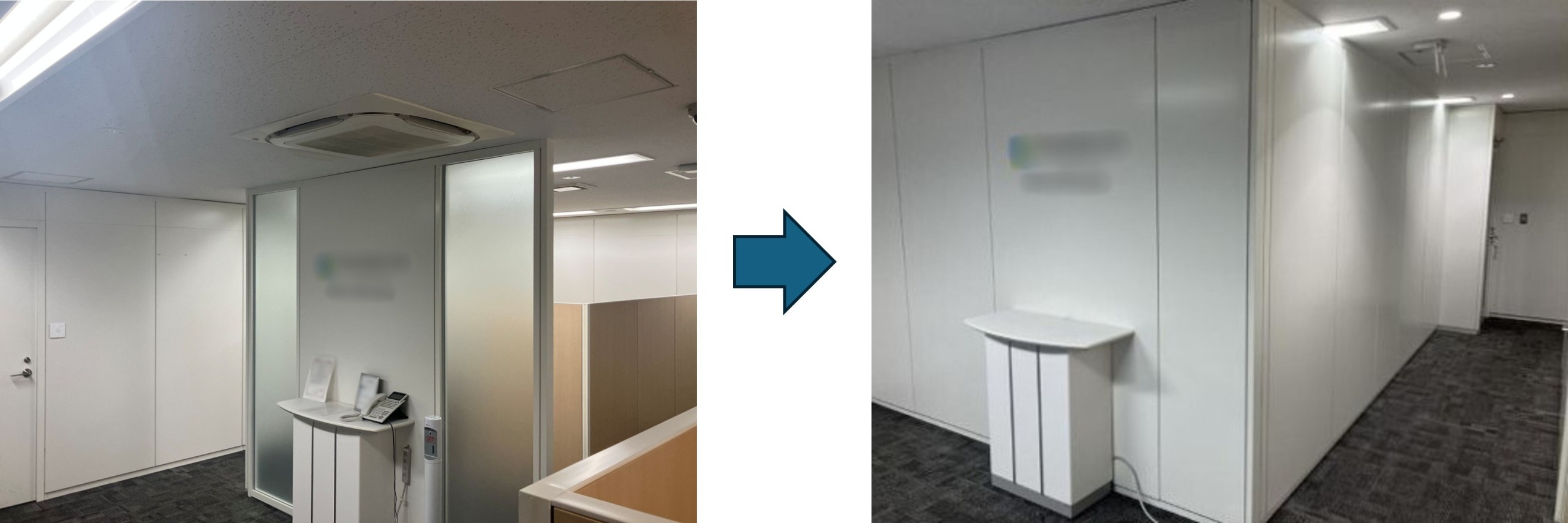 解体済みの什器を搬出後、間仕切りの組み換え作業を実施。