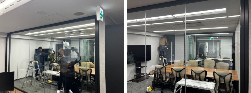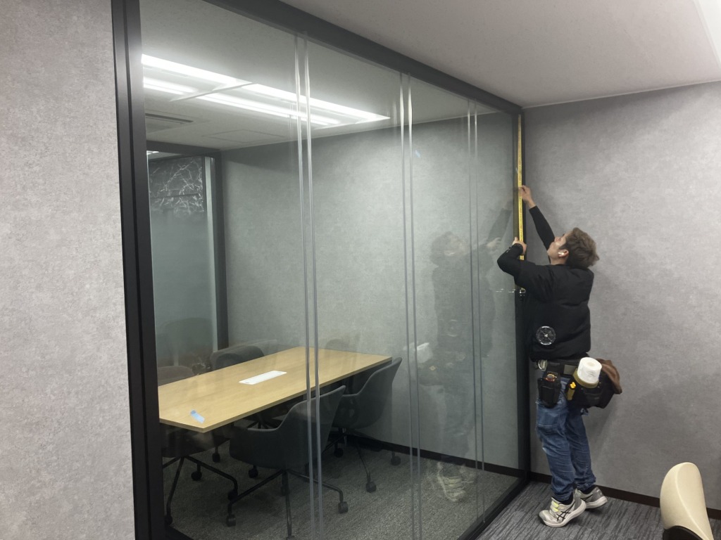 設置したガラス間仕切りには、視線を遮るフォグラスシートを施工しました。これによりプライバシー性が高まり、会議や作業に集中しやすい環境が整いました。施工は短時間で完了し、通常業務に支障をきたすことはありませんでした。