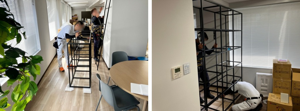 ラック設置中の様子。棚板の取り付けや位置調整を行っています。