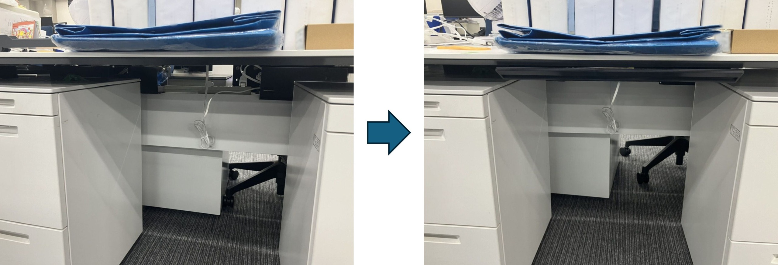 まず、執務デスクへ新しい引き出しの設置を行いました。