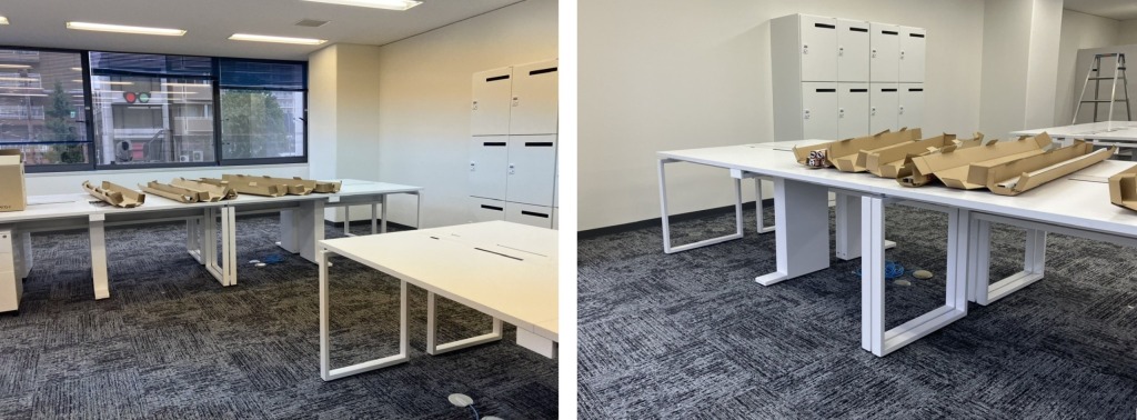 続いて、執務スペースへのデスクなどの什器納品 および 間仕切りの設置 を実施しました。