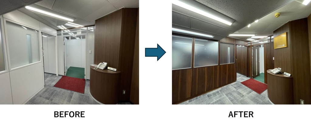 今回のレイアウト変更によって、エントランスから執務室まで全体に統一感が生まれ、事務所の雰囲気が一新されました。業務スペースの使い勝手も大きく改善され、快適にご利用いただけるオフィス環境をご提供することができました。