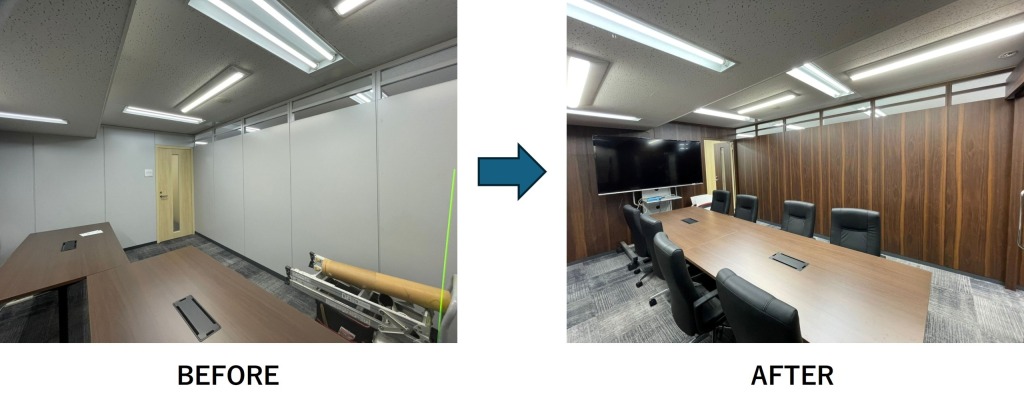 間仕切りにはダイノックシートを施工し、お客様からご要望いただいた「シックで落ち着いた雰囲気」を実現するために、ダーク系や木目調のクロスを採用しました。これにより、全体として重厚感と統一感を兼ね備えた空間が完成しました。