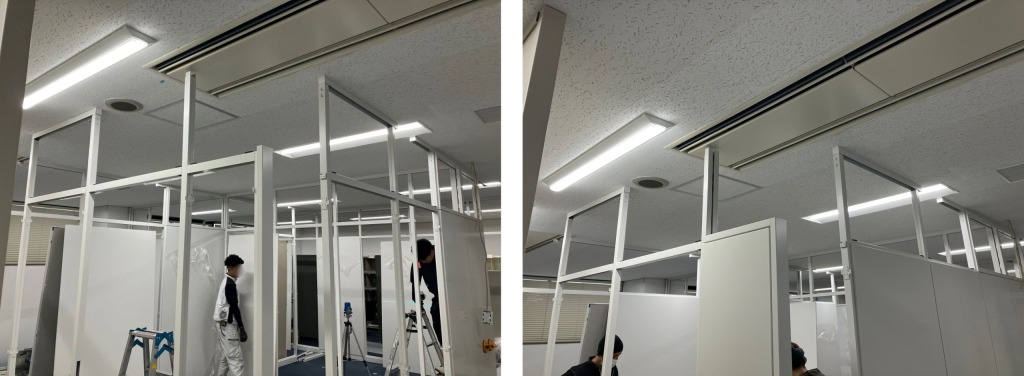 ▶ 新しい間仕切りの設置により、レイアウト変更後の会議室や執務室が完成。空間がすっきりと整理され、動線もスムーズになりました。