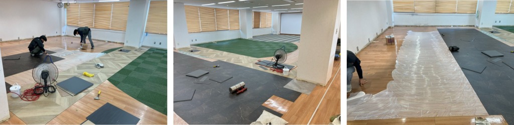 ▶タイルカーペットを捲り既存フローリングの上に塩ビタイルを貼っていきます。