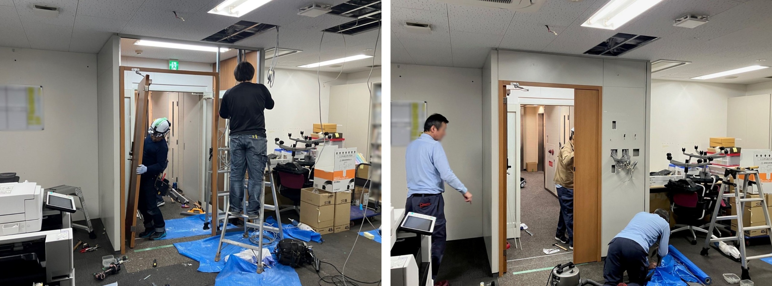 まず既存の間仕切りを丁寧に撤去し、一部は残して間仕切りのサイズを縮小する形で施工しました。
