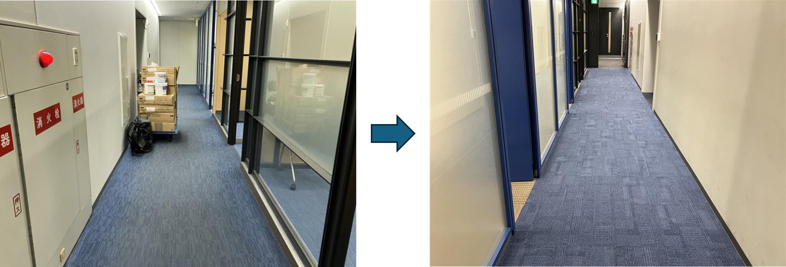 今回の工事では、事務所につながる主要通路と、執務室内の一部エリアを対象にカーペットの貼り替えを実施しました。