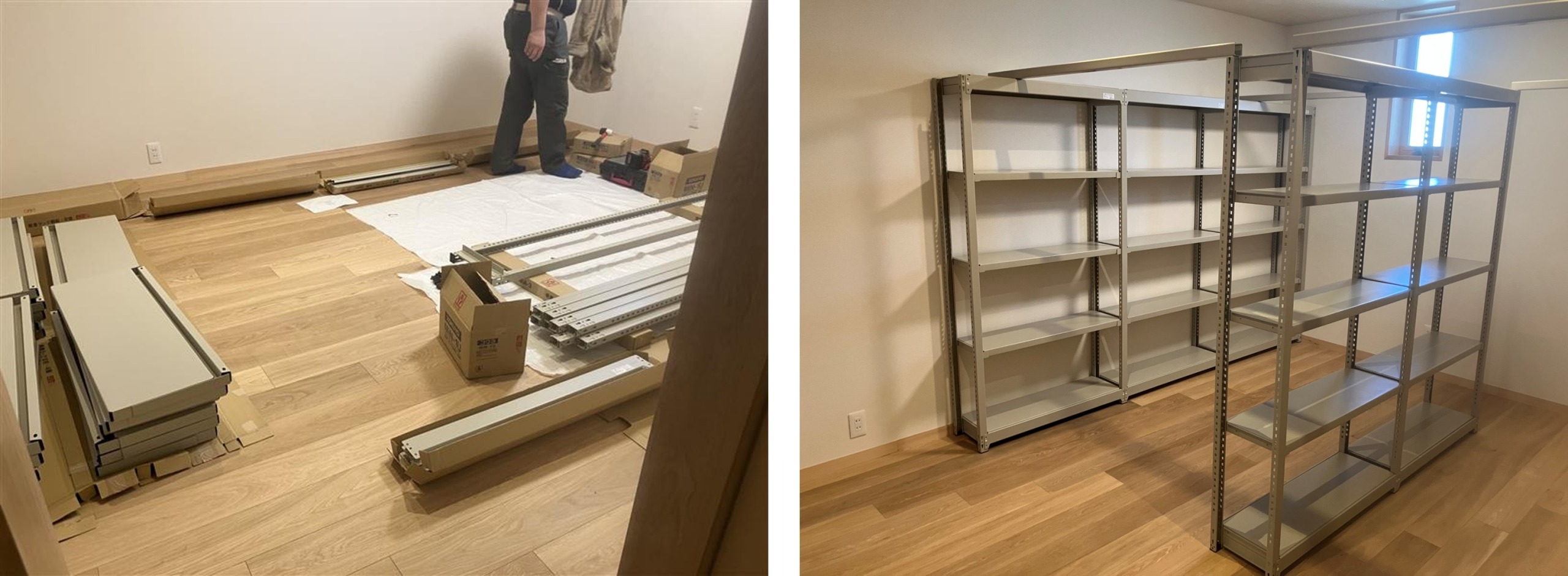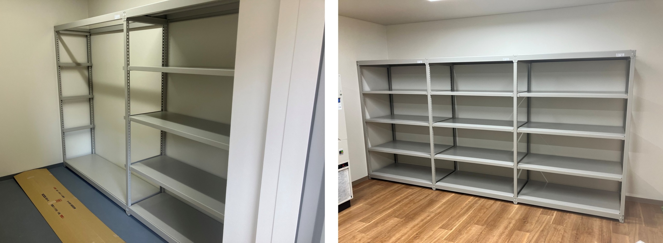 そのうち1カ所は壁への固定ができない条件だったため、ラック同士を連結金具で固定し、耐震性を考慮した施工を実施しました。