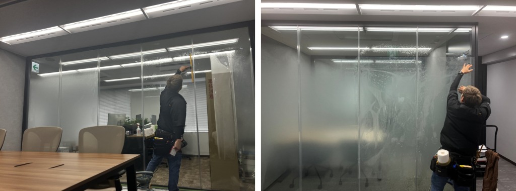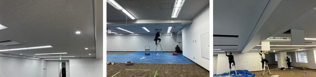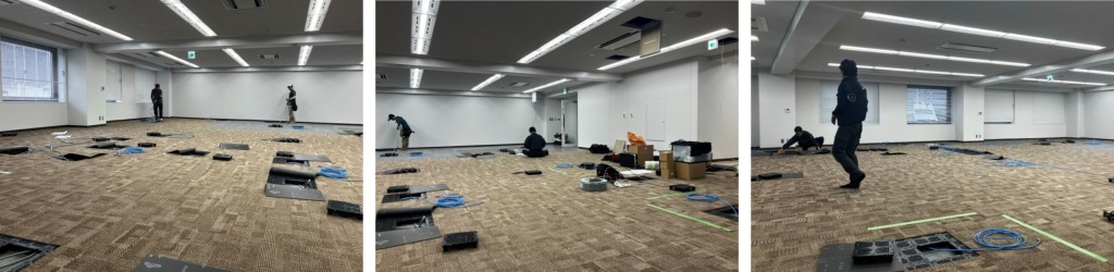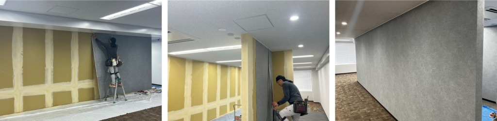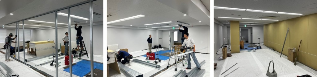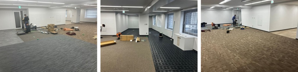 まずはタイルカーペット貼り替えと壁面ラインの墨出し作業を行い、床仕上げと間仕切り位置の精度を確保しました。