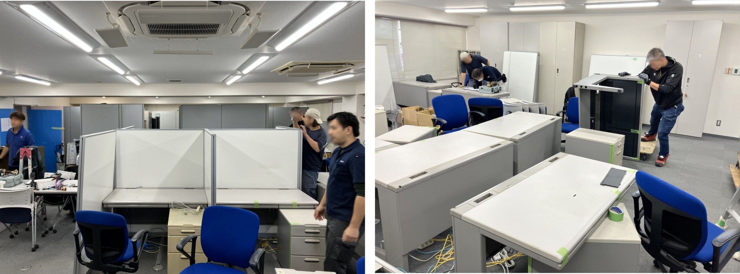 初日は、既存什器の搬出・廃棄およびタイルカーペットの撤去を実施しました。あわせて、ローパーティションの解体・残置作業、既存配線の撤去、フラットケーブルの事前配線を並行して進めています。翌日の作業を円滑に行うための下準備を中心とした工程です。