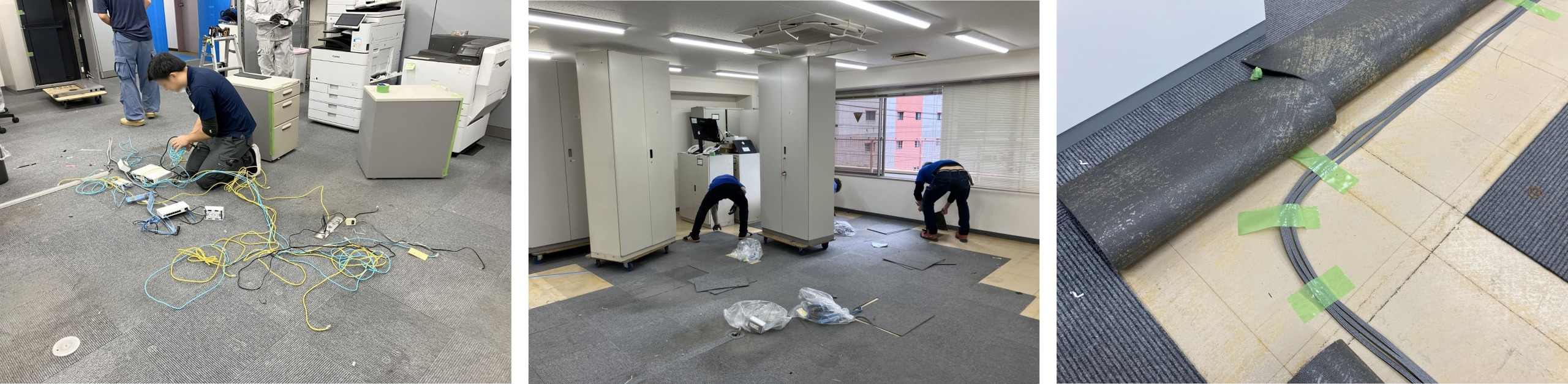 並行して配線整備やモール処理などのインフラ関連作業を進め、レイアウト変更後のオフィス環境を整えました。