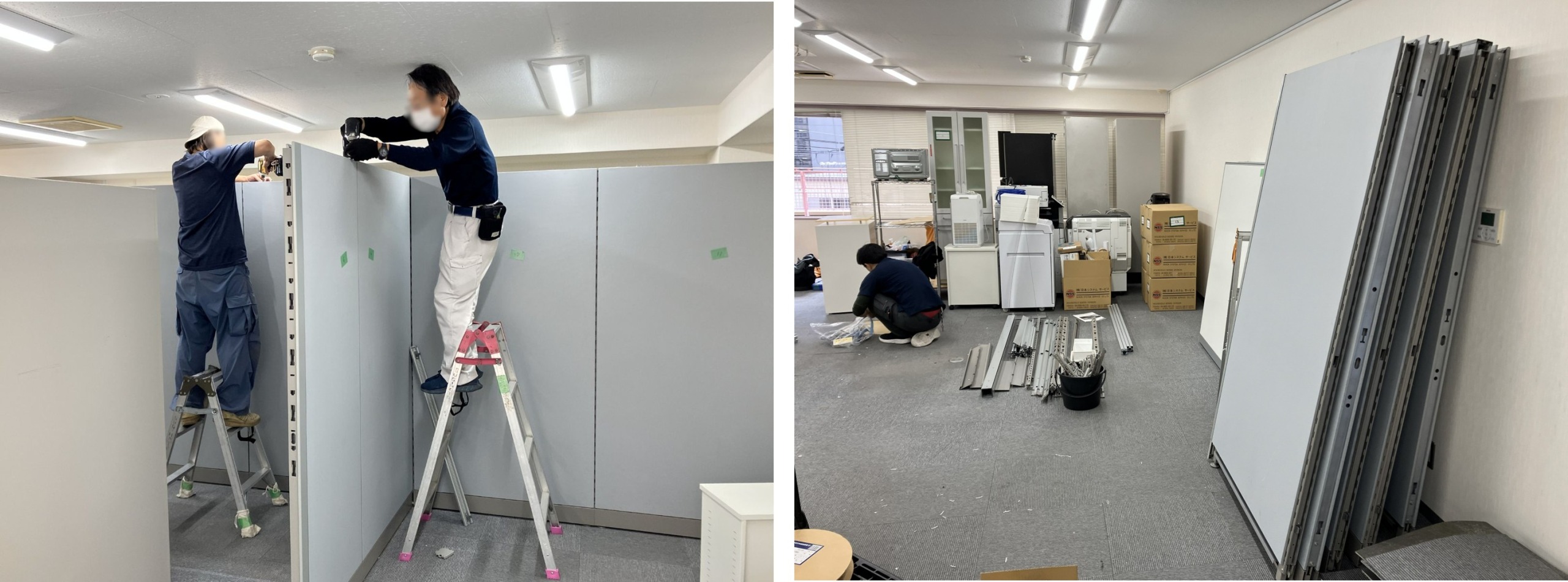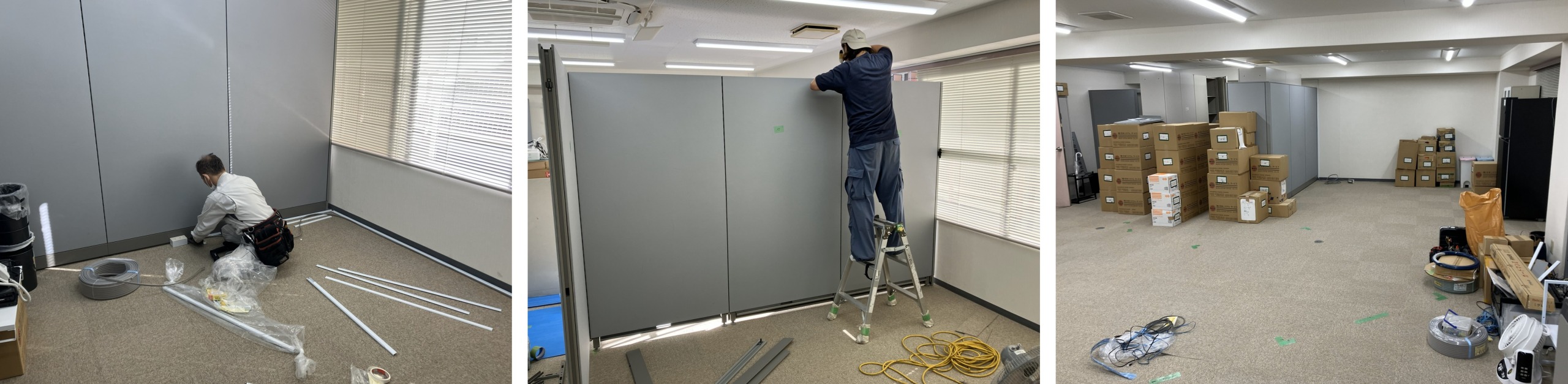 什器を移動させながら貼り進め、施工が完了したエリアから順次ローパーティションの組立を行っています。