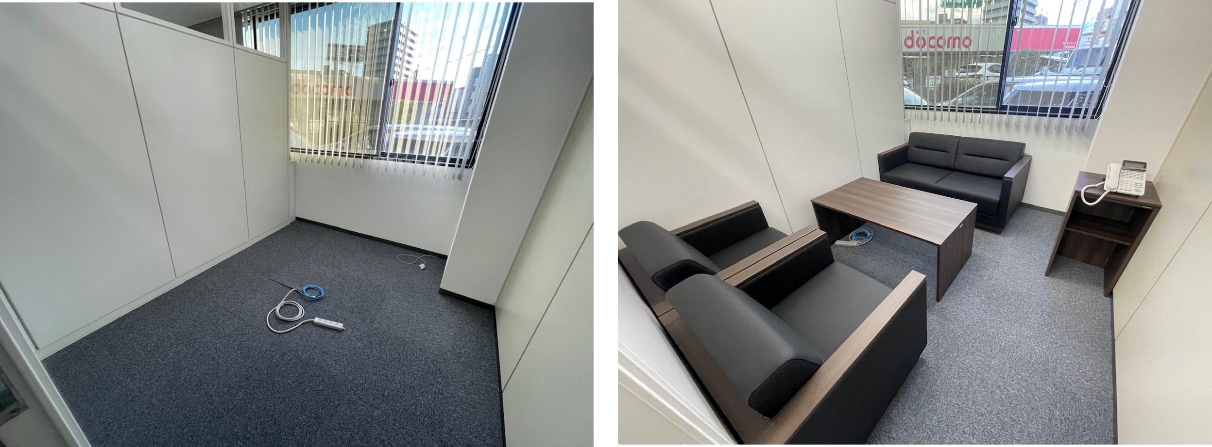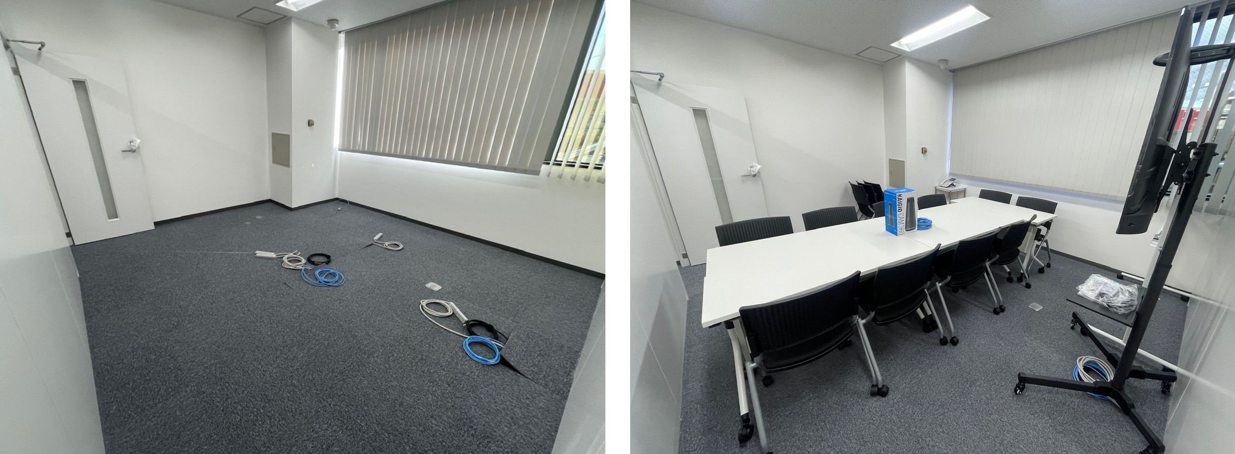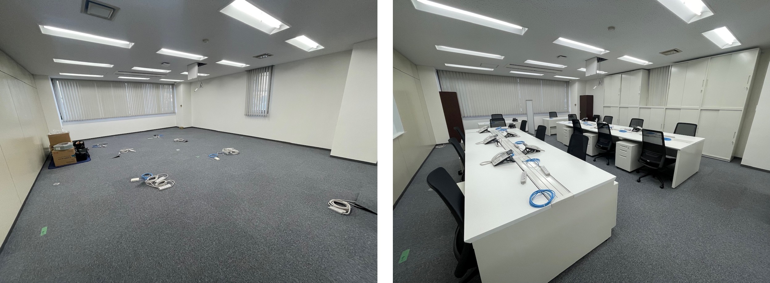 執務デスク、会議用テーブル、応接セットの納品。レイアウト図面に基づき什器を設置し、各席の配線立ち上げを問題なく完了しました。