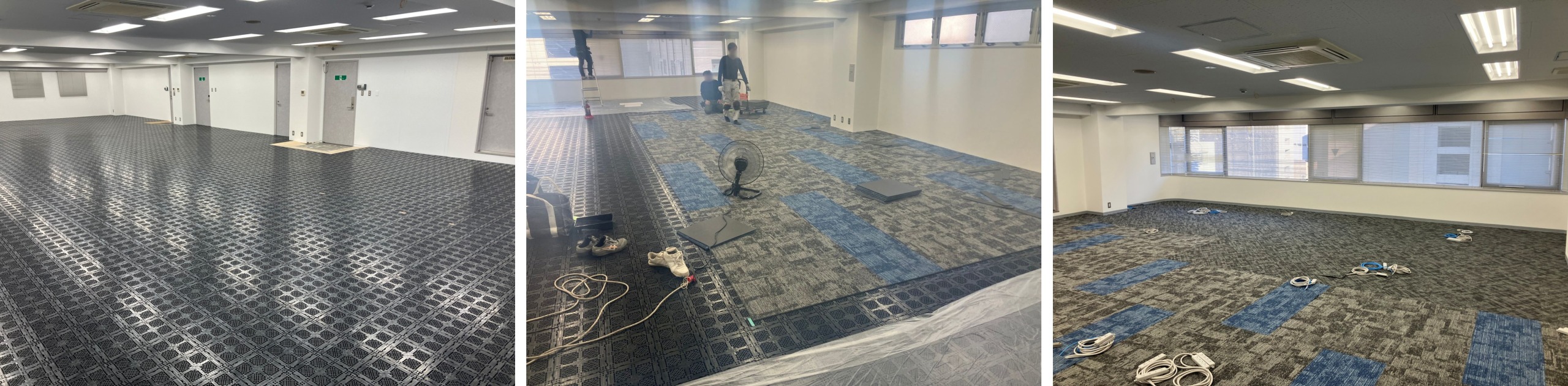 執務エリアのタイルカーペットはコーポレートカラーを取り入れて貼り分け施工を行い、空間に統一感を持たせています。