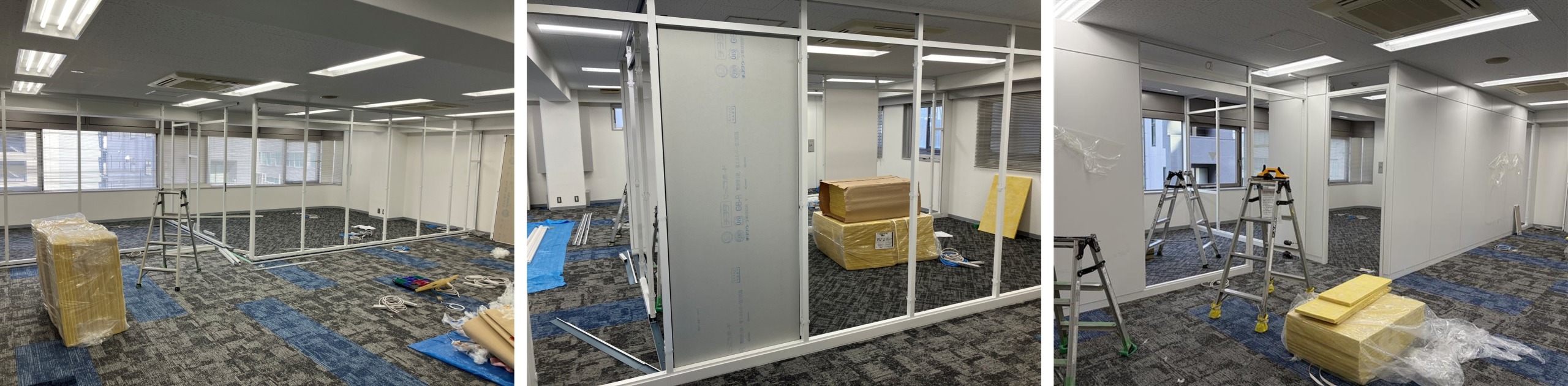 新事務所ではスチールパーティション(ランマクローズ)を採用し、グラスウールを入れることで遮音性を向上させました。